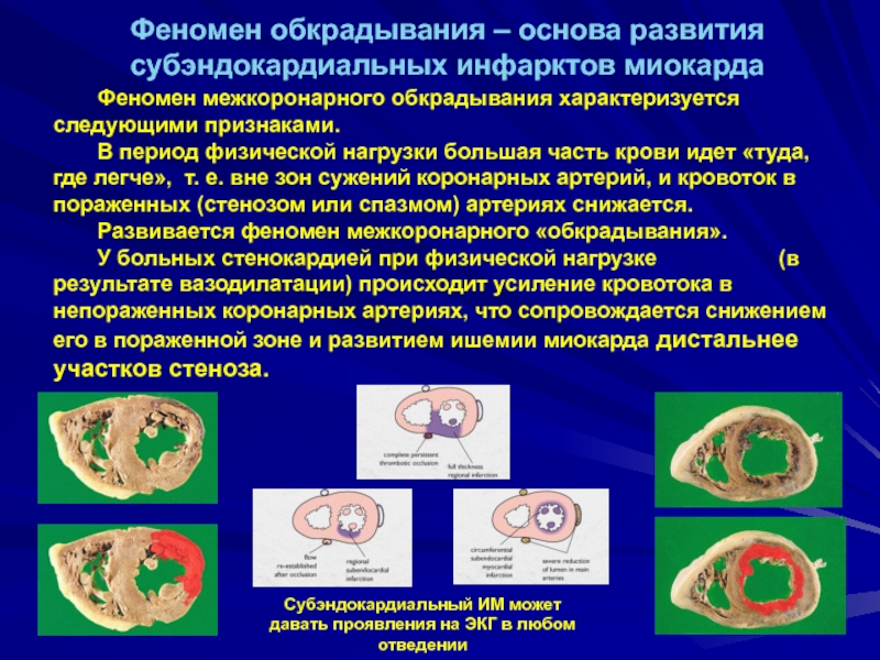 Слайд 23Феномен обкрадывания – основа развития субэндокардиальных инфарктов миокарда