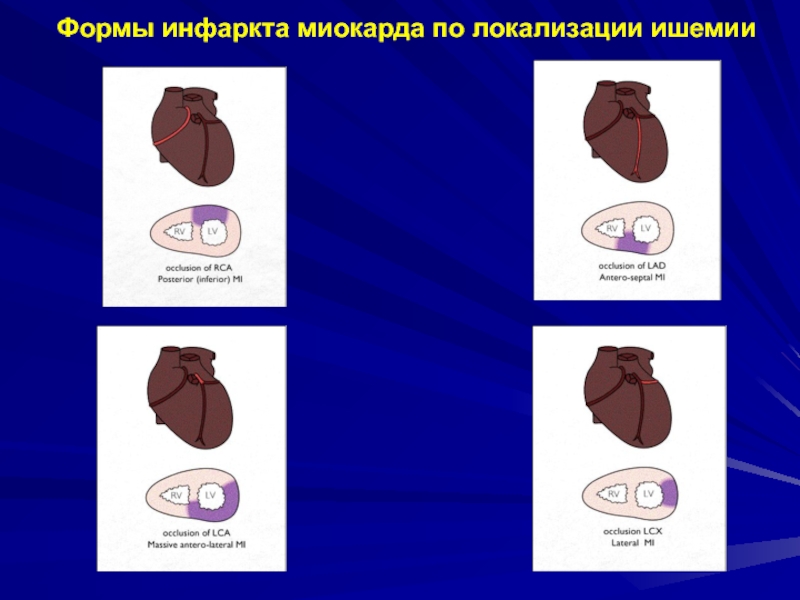 Слайд 22Формы инфаркта миокарда по локализации ишемии