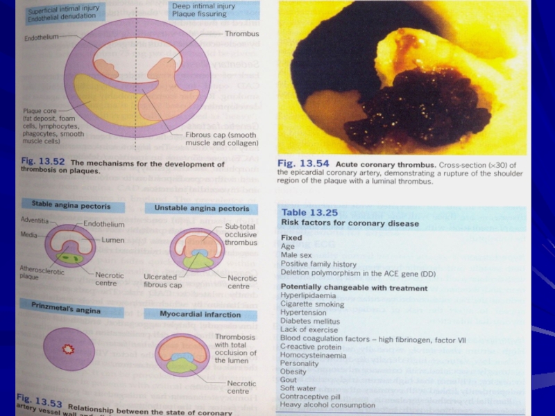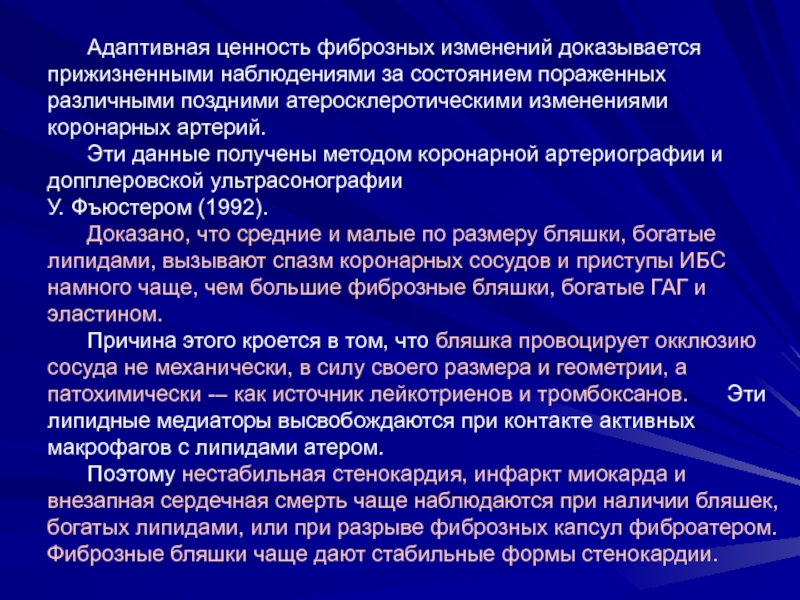 Поэтому нестабильная стенокардия, инфаркт миокарда и внезапная сердечная смерть чаще наблюдаются при наличии бляшек, богатых липидами, или при разрыве фиброзных капсул фиброатером. Фиброзные бляшки чаще дают стабильные формы стенокардии.