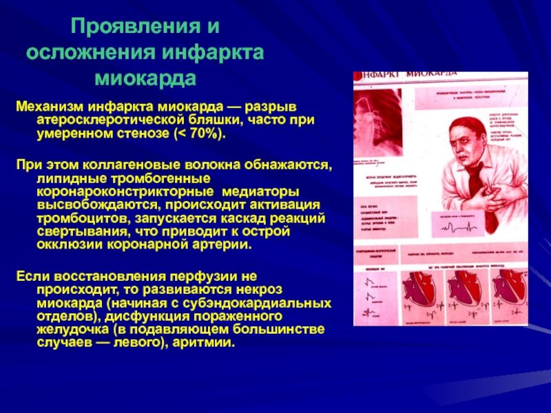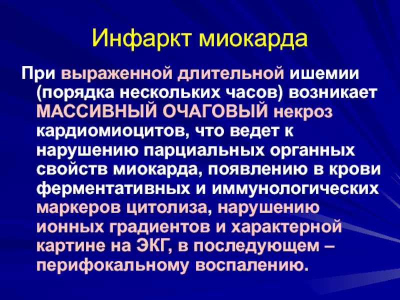 миокарда, появлению в крови ферментативных и иммунологических маркеров цитолиза, нарушению ионных градиентов и характерной картине на ЭКГ, в последующем – перифокальному воспалению.