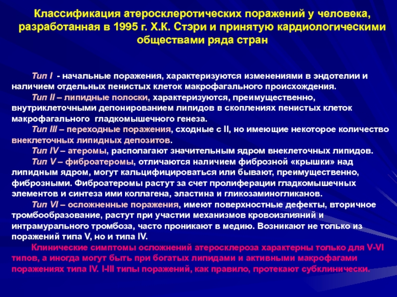 Слайд 17Классификация атеросклеротических поражений у человека, разработанная в 1995 г. Х.К.
