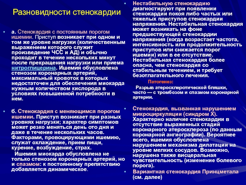 вариантная стенокардия Принцметала, постинфарктная стенокардия).
