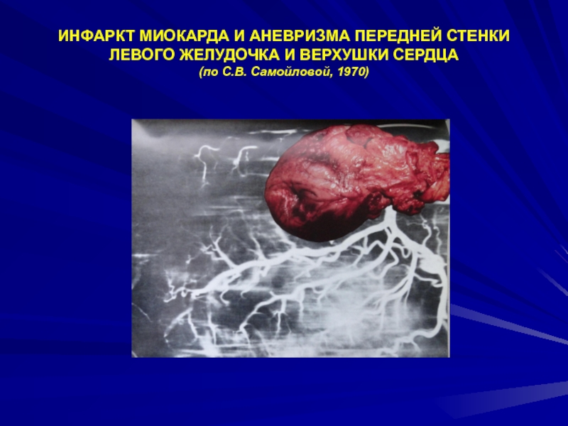 Слайд 35ИНФАРКТ МИОКАРДА И АНЕВРИЗМА ПЕРЕДНЕЙ СТЕНКИ ЛЕВОГО ЖЕЛУДОЧКА И ВЕРХУШКИ