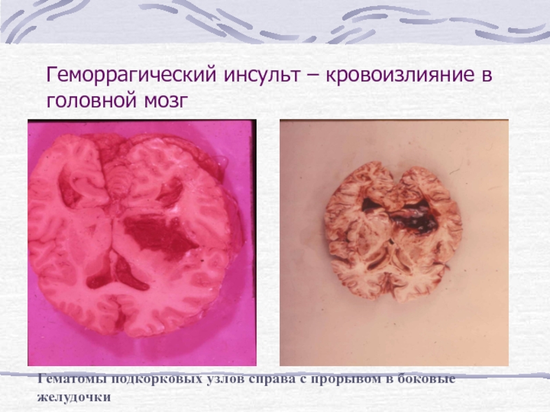 Слайд 30Геморрагический инсульт – кровоизлияние в головной мозг