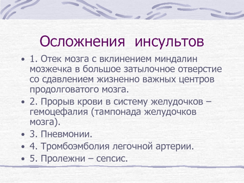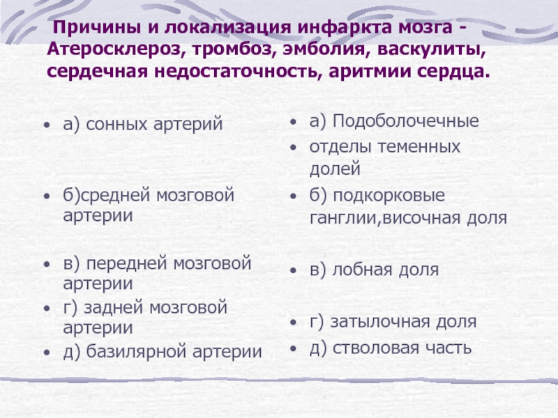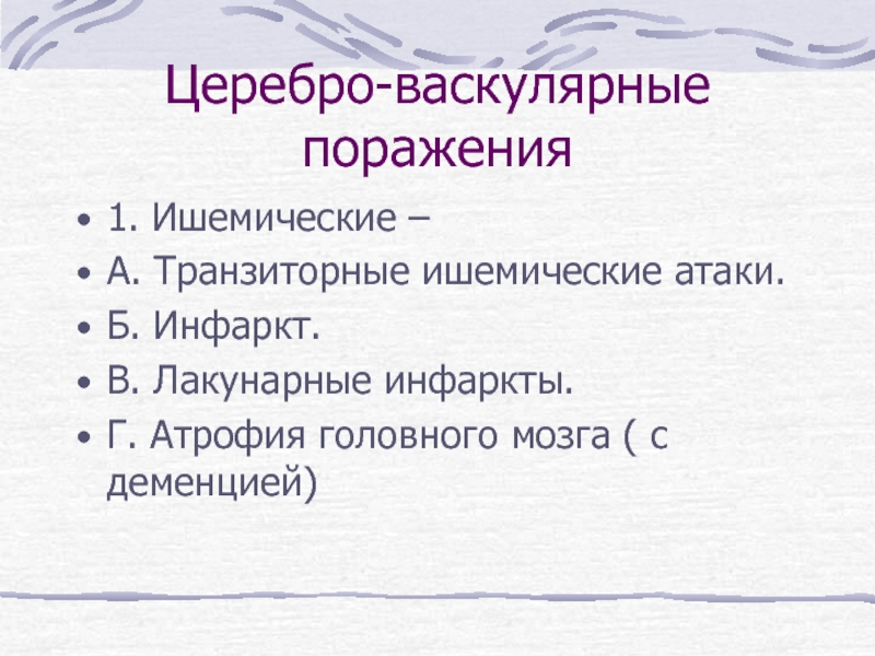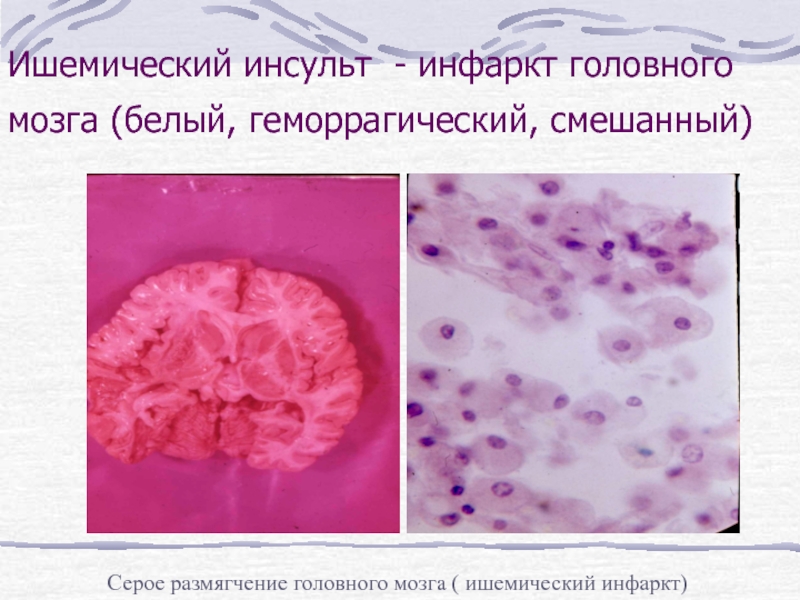 Слайд 28Ишемический инсульт - инфаркт головного мозга (белый, геморрагический, смешанный)