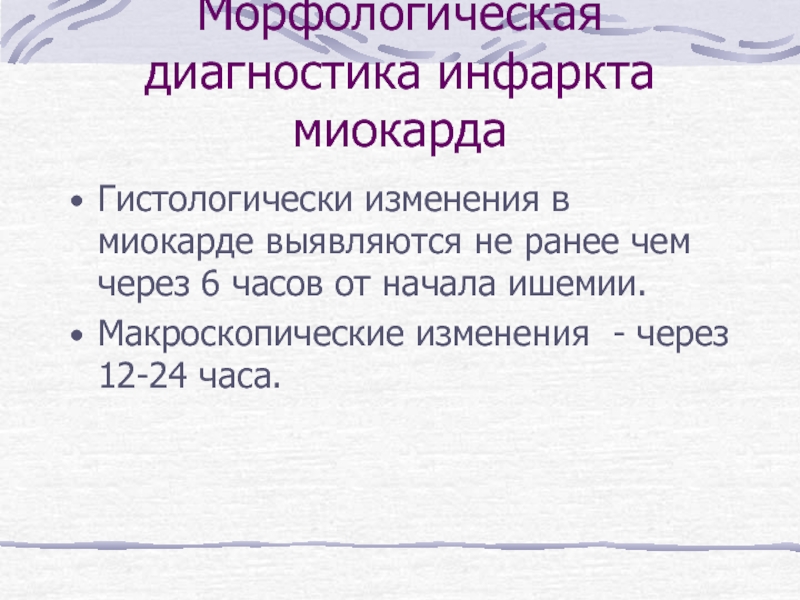 Слайд 13Морфологическая диагностика инфаркта миокарда