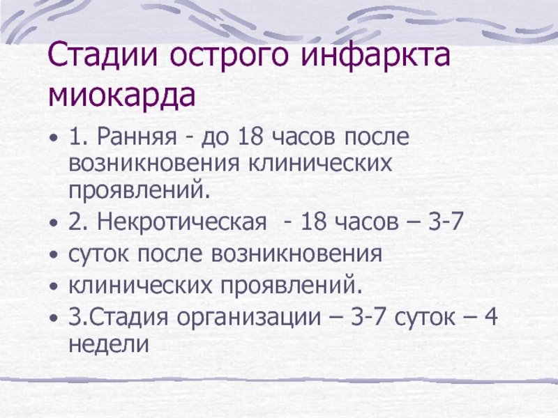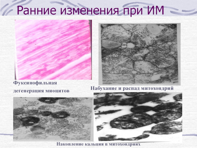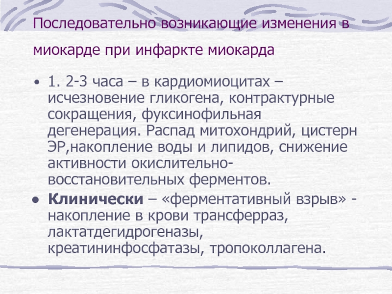 часа – в кардиомиоцитах – исчезновение гликогена, контрактурные сокращения, фуксинофильная