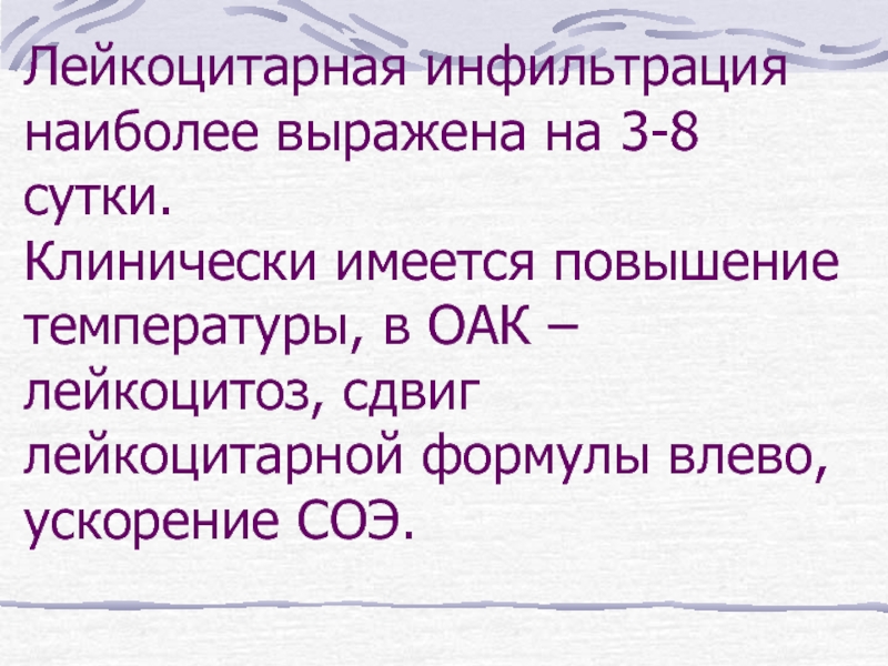 Слайд 17Лейкоцитарная инфильтрация наиболее выражена на 3-8 сутки.