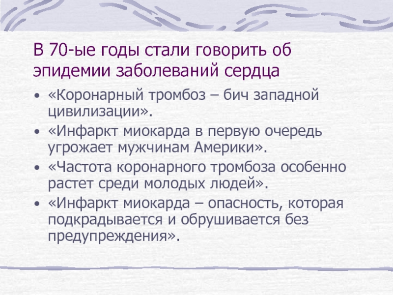 Слайд 4В 70-ые годы стали говорить об эпидемии заболеваний сердца