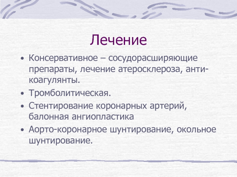 Консервативное – сосудорасширяющие препараты, лечение атеросклероза, анти- коагулянты.
