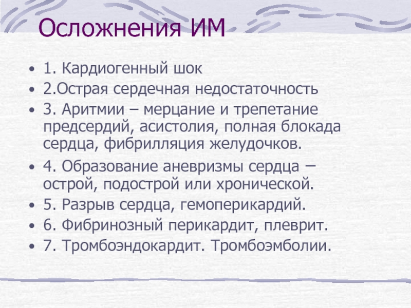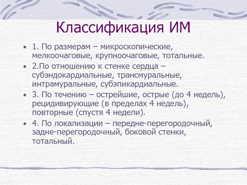 4. По локализации – передне-перегородочный, задне-перегородочный, боковой стенки, тотальный.