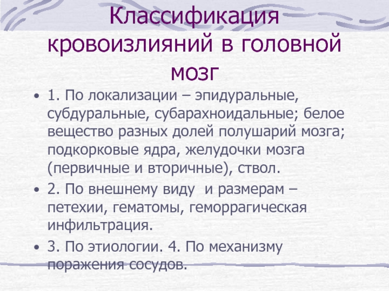 субдуральные, субарахноидальные; белое вещество разных долей полушарий мозга; подкорковые ядра,