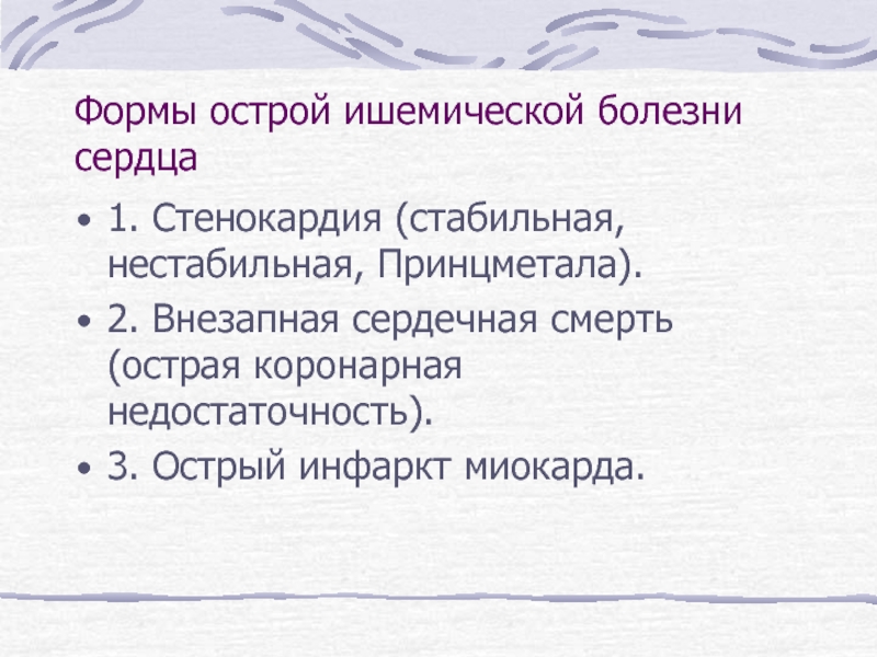 1. Стенокардия (стабильная, нестабильная, Принцметала).