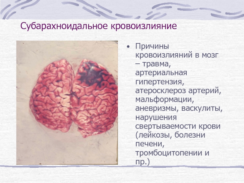 артерий, мальформации, аневризмы, васкулиты, нарушения свертываемости крови (лейкозы, болезни печени,