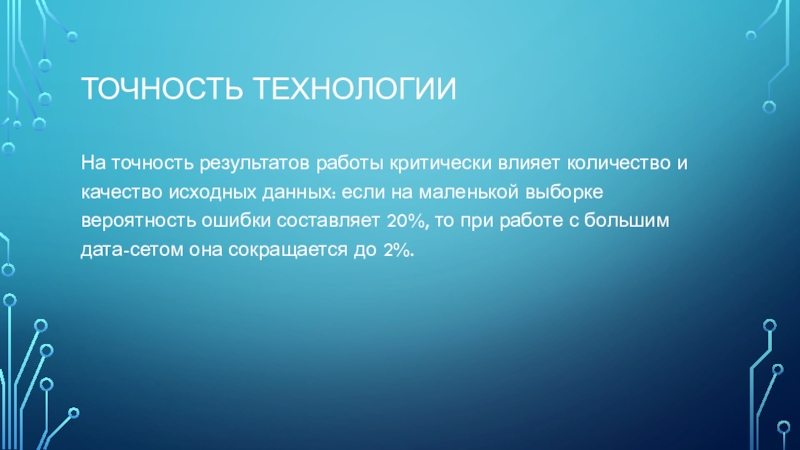 Точность технологииНа точность результатов работы критически влияет количество и качество исходных данных: если на маленькой выборке вероятность