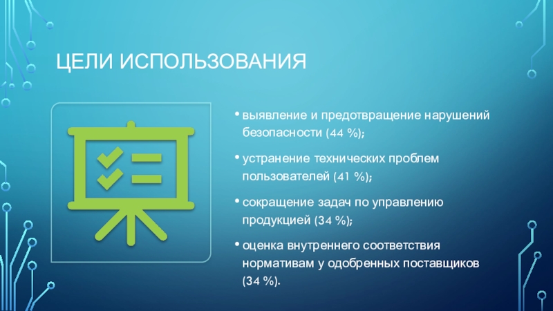 Цели использованиявыявление и предотвращение нарушений безопасности (44 %);устранение технических проблем пользователей (41 %);сокращение задач по управлению продукцией