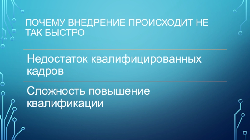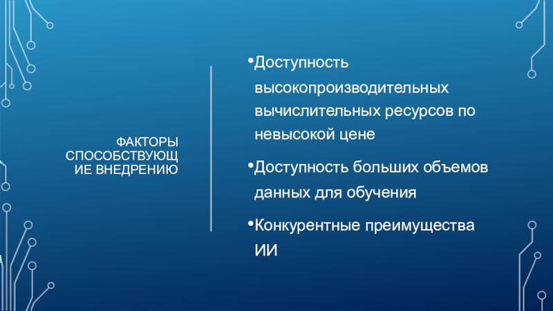 Факторы способствующие внедрениюДоступность высокопроизводительных вычислительных ресурсов по невысокой цене Доступность больших объемов данных для обученияКонкурентные преимущества ИИ