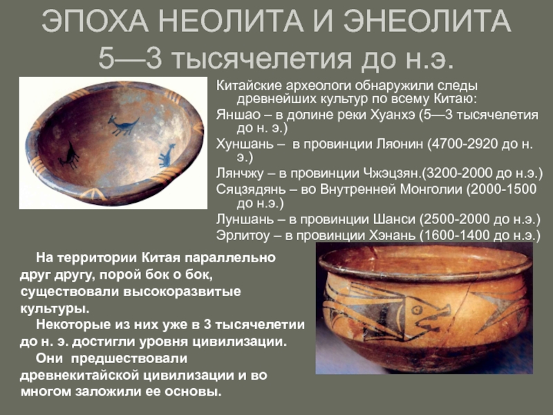 Хуанхэ (5—3 тысячелетия до н. э.)Хуншань – в провинции Ляонин (4700-2920 до н.э.)