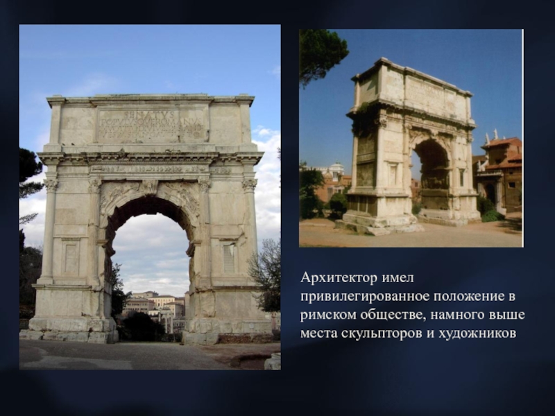 Слайд 5Архитектор имел привилегированное положение в римском обществе, намного выше места