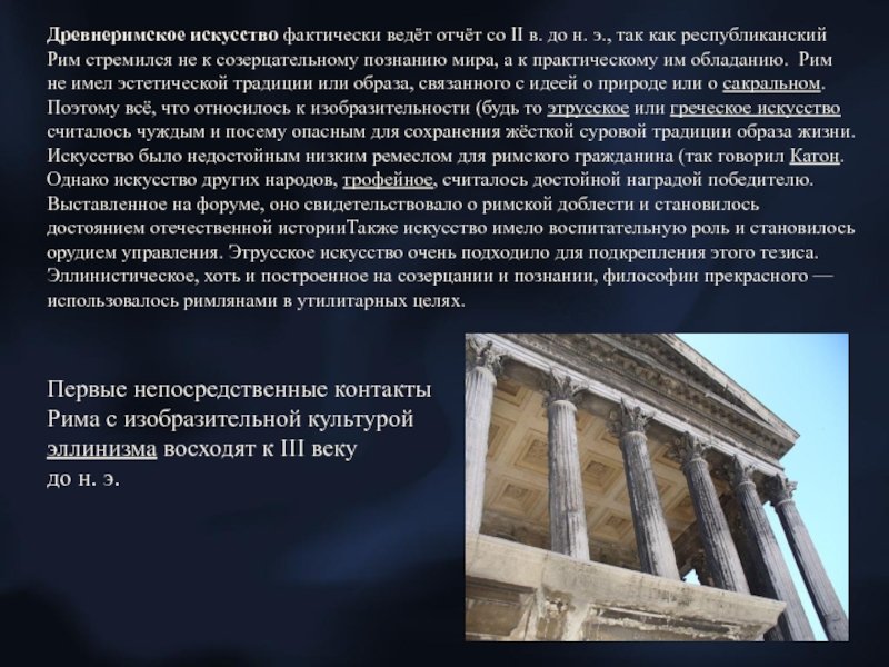 Слайд 2Древнеримское искусство фактически ведёт отчёт со II в. до н. э., так как