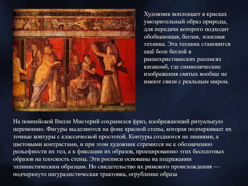 Художник воплощает в красках умозрительный образ природы, для передачи которого подходит обобщающая, беглая, эскизная техника. Эта техника становится ещё боле беглой в раннехристианских росписях катакомб, где символические изображения святых вообще не имеют связи с реальным миром.
