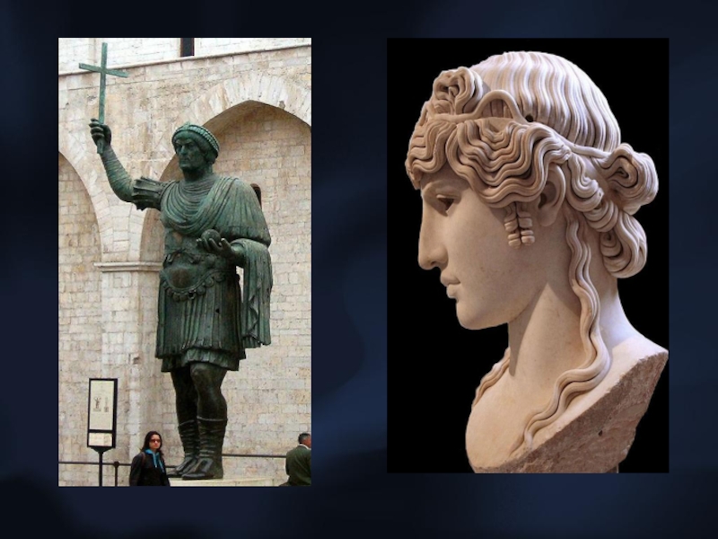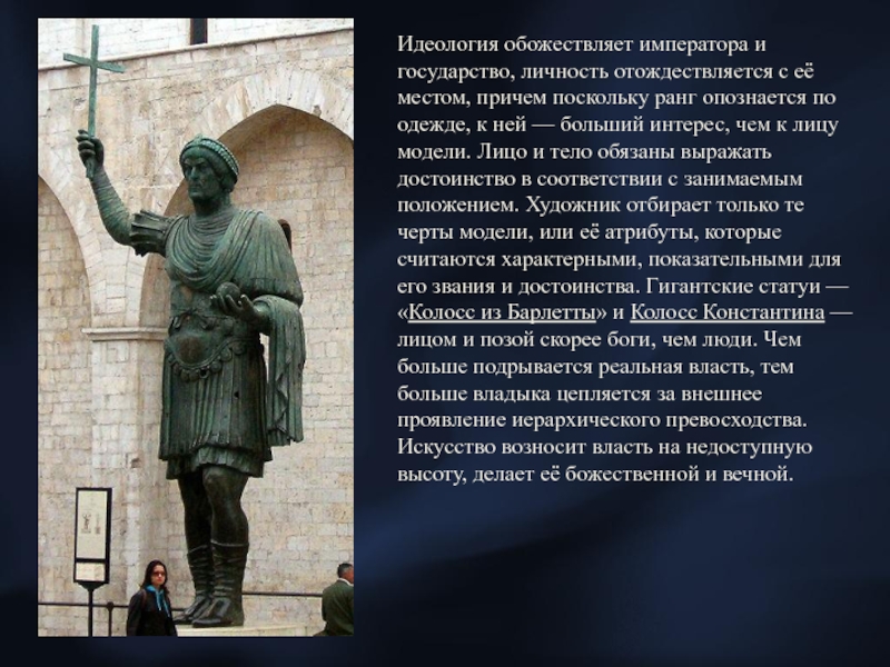 чем к лицу модели. Лицо и тело обязаны выражать достоинство в соответствии с занимаемым положением. Художник отбирает только те черты модели, или её атрибуты, которые считаются характерными, показательными для его звания и достоинства. Гигантские статуи — «Колосс из Барлетты» и Колосс Константина — лицом и позой скорее боги, чем люди. Чем больше подрывается реальная власть, тем больше владыка цепляется за внешнее проявление иерархического превосходства. Искусство возносит власть на недоступную высоту, делает её божественной и вечной.