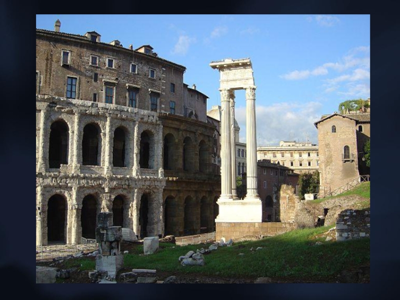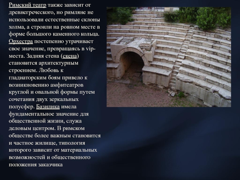 Слайд 7Римский театр также зависит от древнегреческого, но римляне не использовали