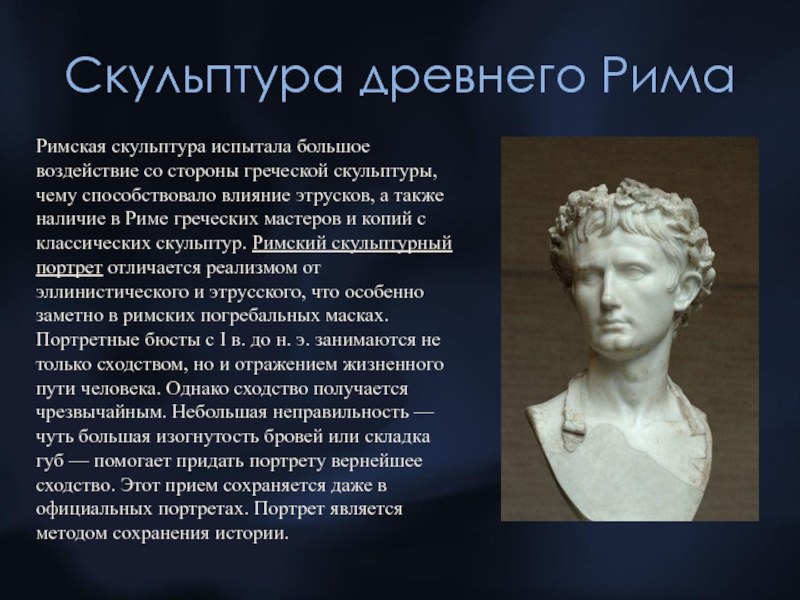 Риме греческих мастеров и копий с классических скульптур. Римский скульптурный портрет отличается реализмом от эллинистического и этрусского, что особенно заметно в римских погребальных масках.