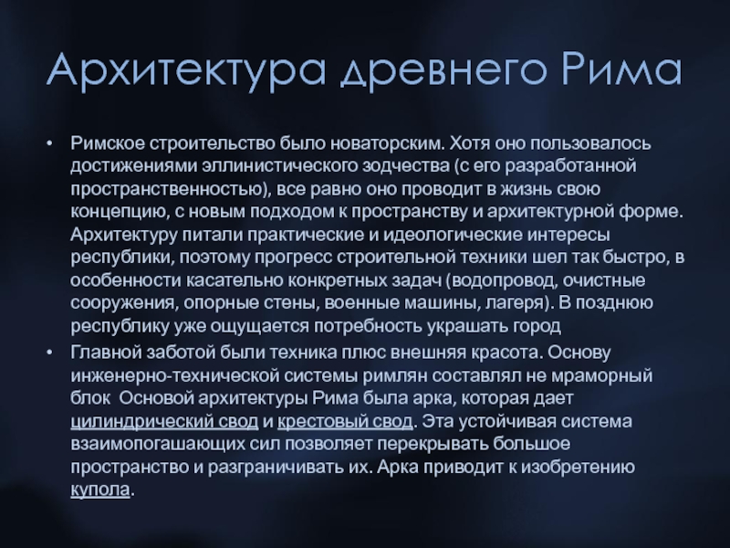 Главной заботой были техника плюс внешняя красота. Основу инженерно-технической системы римлян составлял не мраморный блок Основой архитектуры Рима была арка, которая дает цилиндрический свод и крестовый свод. Эта устойчивая система взаимопогашающих сил позволяет перекрывать большое пространство и разграничивать их. Арка приводит к изобретению купола.