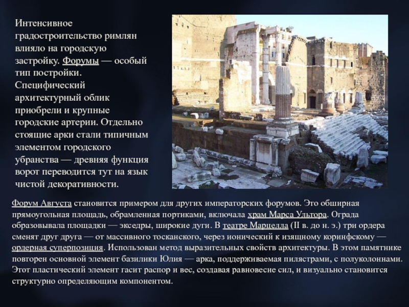 Слайд 10Интенсивное градостроительство римлян влияло на городскую застройку. Форумы — особый тип