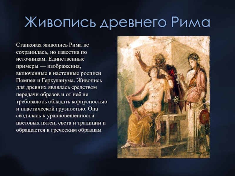 и Геркуланума. Живопись для древних являлась средством передачи образов и от неё не требовалось обладать корпусностью и пластической грузностью. Она сводилась к уравновешенности цветовых пятен, света и традиции и обращается к греческим образцам