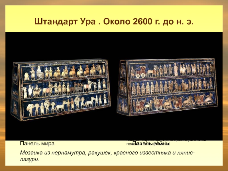 Леонардом Вулли в 1930-е гг. в одной из царских гробниц Ура. Назначение его неизвестно. Вулли предположил, что данный предмет носили на шесте (как штандарт), отсюда его название. Согласно другой теории, «Штандарт Ура» был частью музыкального инструмента. На одной панели штандарта изображены сцены мирной жизни, на другой — военные действия. «Панель войны» представляет собой одно из самых ранних изображений шумерской армии. Боевые колесницы, запряженные четырьмя онаграми каждая, прокладывают дорогу, попирая тела врагов; пешие воины в плащах вооружены копьями; врагов убивают топорами, пленников в раздетом виде ведут к царю, который также держит в руках копье. «Панель мира» изображает ритуальный пир. Процессии несут на пир животных, рыбу и иную снедь. Сидящие фигуры, одетые в юбки с бахромой, пьют вино под аккомпанемент музыканта, играющего на лире. Такого рода сцены весьма характерны для цилиндрических печатей того времени.