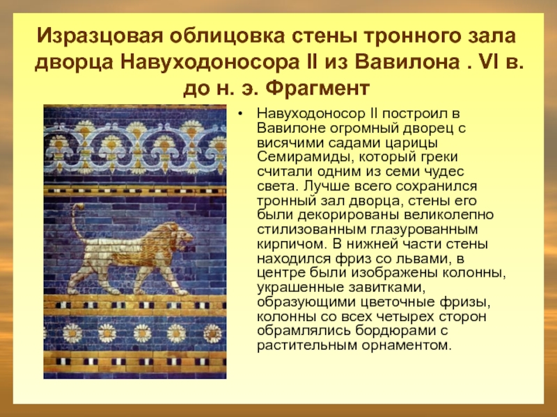 в Вавилоне огромный дворец с висячими садами царицы Семирамиды, который греки считали одним из семи чудес света. Лучше всего сохранился тронный зал дворца, стены его были декорированы великолепно стилизованным глазурованным кирпичом. В нижней части стены находился фриз со львами, в центре были изображены колонны, украшенные завитками, образующими цветочные фризы, колонны со всех четырех сторон обрамлялись бордюрами с растительным орнаментом.