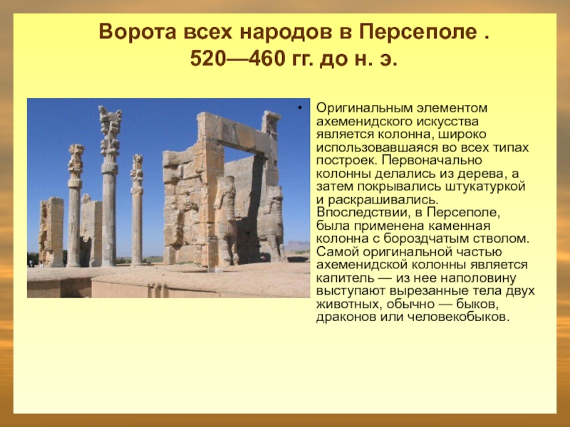 всех типах построек. Первоначально колонны делались из дерева, а затем покрывались штукатуркой и раскрашивались. Впоследствии, в Персеполе, была применена каменная колонна с бороздчатым стволом. Самой оригинальной частью ахеменидской колонны является капитель — из нее наполовину выступают вырезанные тела двух животных, обычно — быков, драконов или человекобыков.