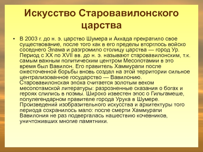 войско соседнего Элама и разгромило столицу царства — город Ур. Период с XX по XVII вв. до н. э. называют старовавилонским, т.к. самым важным политическим центром Месопотамии в это время был Вавилон. Его правитель Хаммурапи после ожесточенной борьбы вновь создал на этой территории сильное централизованное государство — Вавилонию. Старовавилонская эпоха считается золотым веком месопотамской литературы: разрозненные сказания о богах и героях слились в поэмы. Широко известен эпос о Гильгамеше, полулегендарном правителе города Урука в Шумере. Произведений изобразительного искусства и архитектуры того периода сохранилось мало: после смерти Хаммурапи Вавилония не раз подвергалась нашествию кочевников, уничтоживших многие памятники.