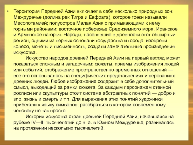 Искусство народов древней Передней Азии на первый взгляд может показаться сложным и загадочным: сюжеты, приемы изображения людей или событий, отображение пространственно-временных отношений — все это основывалось на специфических представлениях и верованиях древних людей. Любое изображение содержит в себе дополнительный смысл, выходящий за рамки сюжета. За каждым персонажем стенной росписи или скульптуры стоит система абстрактных понятий — добро и зло, жизнь и смерть и т.п. Для выражения этих понятий художники прибегали к языку символов, разобраться в котором современному человеку не так просто.