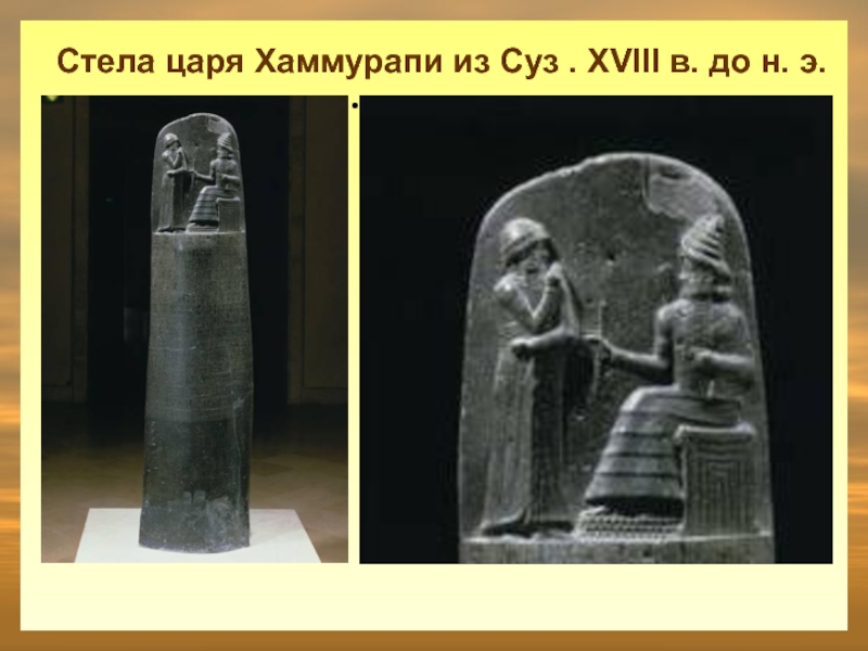 Слайд 12Стела царя Хаммурапи из Суз . XVIII в. до н.