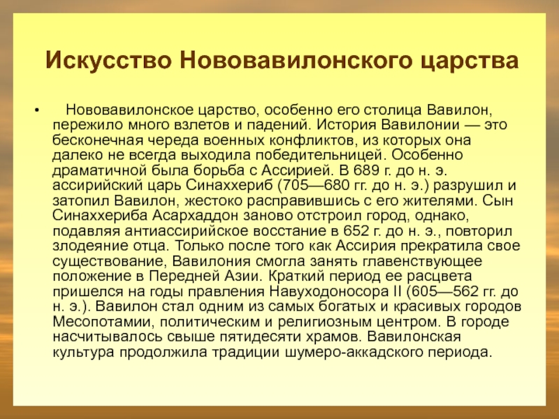 из которых она далеко не всегда выходила победительницей. Особенно драматичной была борьба с Ассирией. В 689 г. до н. э. ассирийский царь Синаххериб (705—680 гг. до н. э.) разрушил и затопил Вавилон, жестоко расправившись с его жителями. Сын Синаххериба Асархаддон заново отстроил город, однако, подавляя антиассирийское восстание в 652 г. до н. э., повторил злодеяние отца. Только после того как Ассирия прекратила свое существование, Вавилония смогла занять главенствующее положение в Передней Азии. Краткий период ее расцвета пришелся на годы правления Навуходоносора II (605—562 гг. до н. э.). Вавилон стал одним из самых богатых и красивых городов Месопотамии, политическим и религиозным центром. В городе насчитывалось свыше пятидесяти храмов. Вавилонская культура продолжила традиции шумеро-аккадского периода.