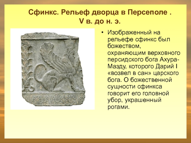 бога Ахура-Мазду, которого Дарий I «возвел в сан» царского бога. О божественной сущности сфинкса говорит его головной убор, украшенный рогами.