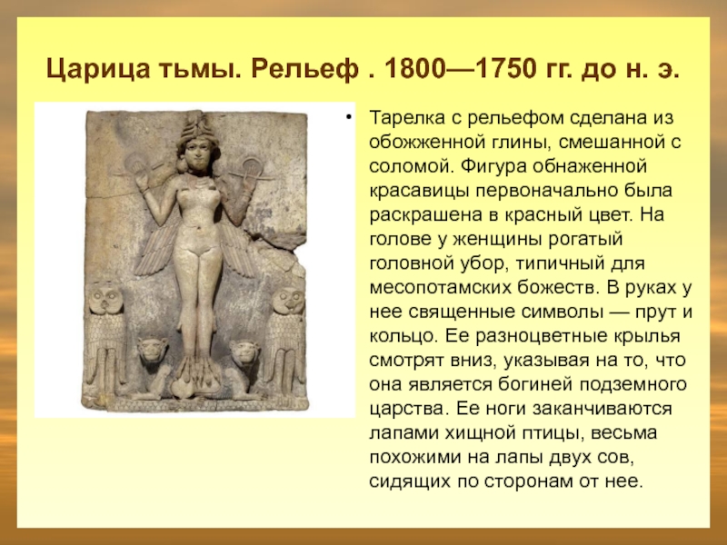 обнаженной красавицы первоначально была раскрашена в красный цвет. На голове у женщины рогатый головной убор, типичный для месопотамских божеств. В руках у нее священные символы — прут и кольцо. Ее разноцветные крылья смотрят вниз, указывая на то, что она является богиней подземного царства. Ее ноги заканчиваются лапами хищной птицы, весьма похожими на лапы двух сов, сидящих по сторонам от нее.
