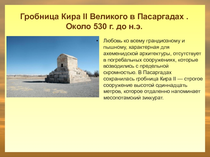 ахеменидской архитектуры, отсутствует в погребальных сооружениях, которые возводились с предельной скромностью. В Пасаргадах сохранилась гробница Кира II — строгое сооружение высотой одиннадцать метров, которое отдаленно напоминает месопотамский зиккурат.