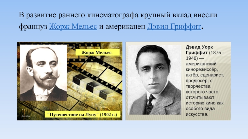 Слайд 9В развитие раннего кинематографа крупный вклад внесли француз Жорж Мельес и американец Дэвид