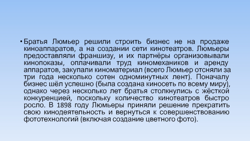 Слайд 8Братья Люмьер решили строить бизнес не на продаже киноаппаратов, а