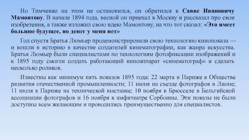 Москву и рассказал про свои изобретения, а также изложил свою идею Мамонтову, на что тот сказал: «Это имеет большое будущее, но денег у меня нет»