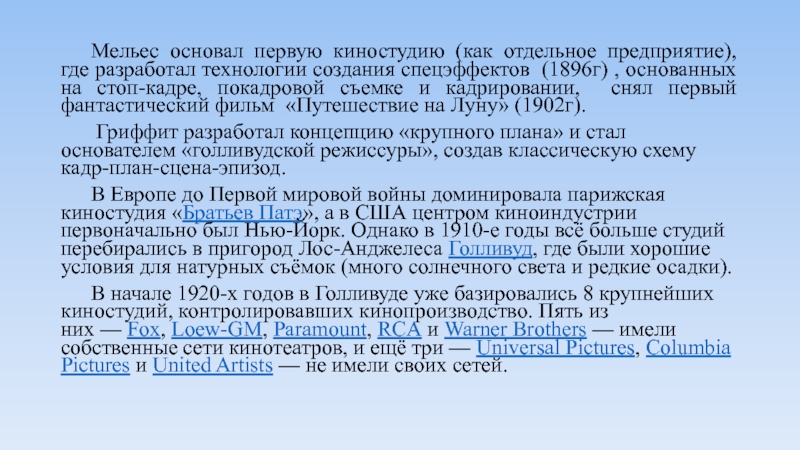 Слайд 10 Мельес основал первую киностудию (как отдельное предприятие), где разработал технологии
