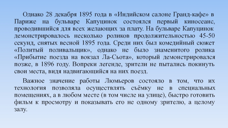желающих за плату. На бульваре Капуцинок демонстрировалось несколько роликов продолжительностью 45-50 секунд, снятых весной 1895 года. Среди них был комедийный сюжет «Политый поливальщик», однако не было знаменитого ролика «Прибытие поезда на вокзал Ла-Сьота», который демонстрировался позже, в 1896 году. Вопреки легенде, зрители не пытались покинуть свои места, видя надвигающийся на них поезд.