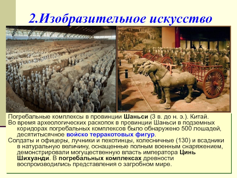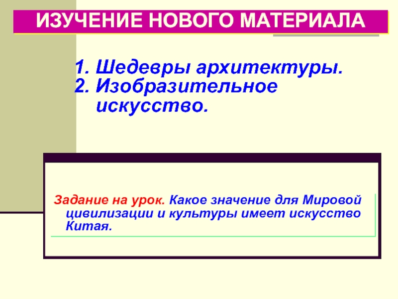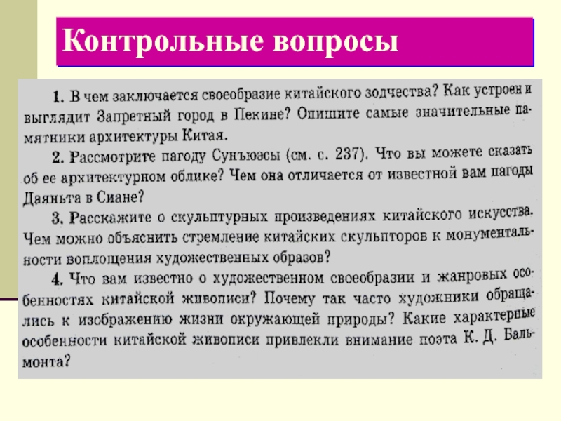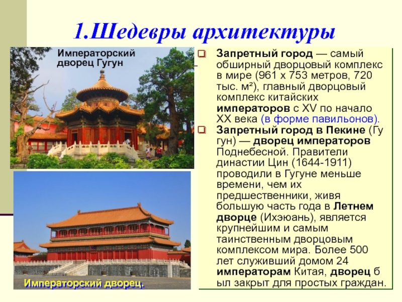 Крупнейший памятник архитектуры - Великая китайская стена. Идея защиты от набегов кочевых племён с севера. Проходит по северному Китаю на протяжении 8851,8 км (с учётом ответвлений), а на участке Бадалин проходит в непосредственной близости от Пекина. Строительство первой стены началось в III веке до н. э., а завершилось в XV веке. Ширина 5-8 м, башни через 100-150 м ля сигнала о приближении врага.