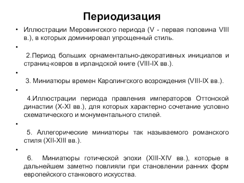 ПериодизацияИллюстрации Меровингского периода (V - первая половина VIII в.), в которых доминировал упрощенный стиль.  2.Период больших
