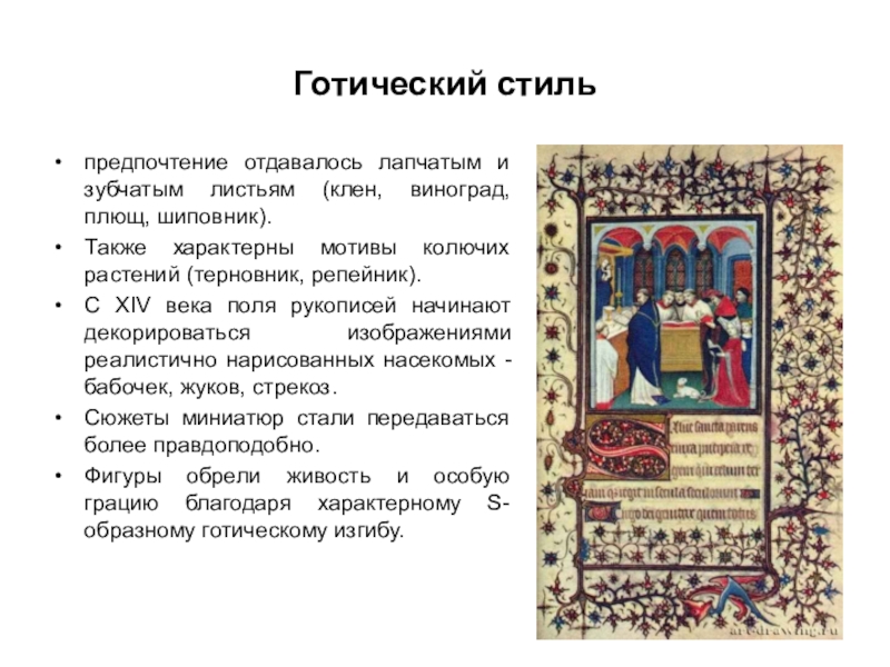 Готический стильпредпочтение отдавалось лапчатым и зубчатым листьям (клен, виноград, плющ, шиповник). Также характерны мотивы колючих растений (терновник,