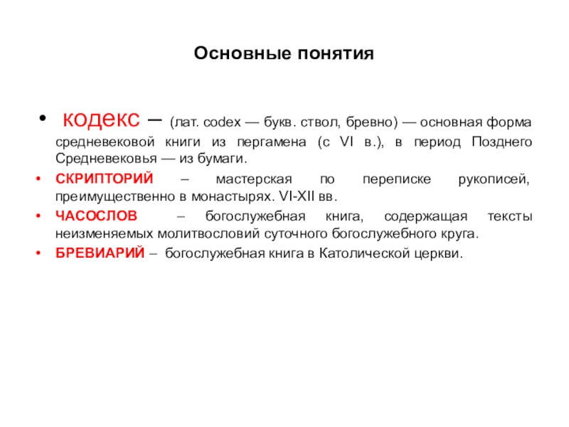 Основные понятия кодекс – (лат. codex — букв. ствол, бревно) — основная форма средневековой книги из пергамена (с VI